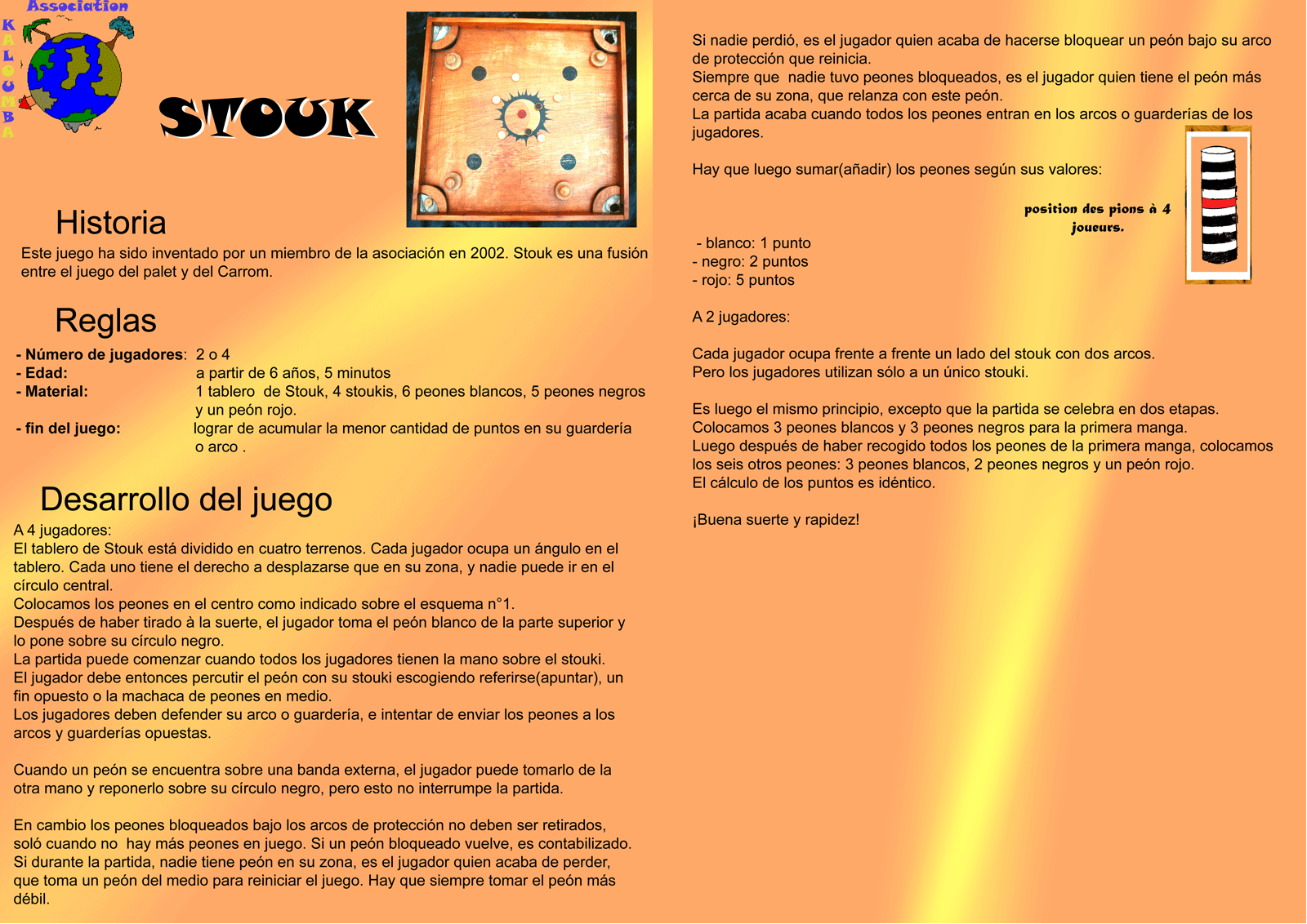 Abalone-315 ASALTOType de jeu : Réflexion Origine : AngleterreDate : XIX Siècle Nbre de joueurs : 2Age : 8 ansDurée : 25mn BAGH-CHAL BIZINGOType de jeu : Réflexion Origine : CanadaDate : XIX Siècle Nbre de joueurs : 2Age : 7 ansDurée : 20 min BOULES-CARREESType de jeu : Adresse Origine : FranceDate : XX Siècle Nbre de joueurs : Apartir de 2Age : 6 ansDurée : 15 min CARROMType de jeu : Adresse Origine : IndeDate : XIX Siècle Nbre de joueurs : A partir de 2Age : 6 ansDurée : 20 min DAMESType de jeu : Réflexion Origine : EuropeDate : XV Siècle Nbre de joueurs : 2Age : 6 ansDurée : 15 min FERMER-LA-BOITEType de jeu : Hasard et Stratégie Origine : AngleterreDate : XII Siècle Nbre de joueurs : 1 + PlusAge : 6 ansDurée : 5 min DAMES-CHINOISESType de jeu : Réflexion Origine : EuropeDate : XIX Siècle Nbre de joueurs : A partir de 2Age : 6 ansDurée : 30 min DIVIYNAType de jeu : Réflexion Origine : Sri LankaDate : Inconnue Nbre de joueurs : 2Age : 7 ansDurée : 15 min ATTAQUE-DES-ANIMAUXType de jeu : Réflexion Origine : FranceDate : XIX Siècle Nbre de joueurs : 2Age : 8 ansDurée : 40mn PALETOSType de jeu : Adresse Origine : EuropeDate : XX Siècle Nbre de joueurs : 2Age : 6 ansDurée : 5 min FANORONAType de jeu : Réflexion Origine : MadagascarDate : XIX Siècle Nbre de joueurs : 2Age : 8 ansDurée : 25 min FLIPPERType de jeu : Adresse Origine :FranceDate : XIX Siècle Nbre de joueurs : 1 + PlusAge : 5 ansDurée : 5 min GAPIONType de jeu : Adresse Origine :FranceDate : XX Siècle Nbre de joueurs : A partir de 2Age : 6 ansDurée : 15 min GOMOKUType de jeu : Réflexion Origine : CoréeDate : Inconnue Nbre de joueurs : 2Age : 8 ansDurée : 20 min HYMALAYOUType de jeu : Adresse Origine : InconnueDate : XX Siècle Nbre de joueurs : 1 + PlusAge : 6 ansDurée : 5 min JEU-DU-LABYRINTHEType de jeu : Réflexion Origine : FranceDate : XX Siècle Nbre de joueurs : 4Age : 8 ansDurée : 30 min JEU-DU-MARTEAUType de jeu : Adresse Origine : Europe du NordDate : XIX Siècle Nbre de joueurs : 4Age : 6 ansDurée : 10 min KUBBType de jeu : Adresse Origine : SuedeDate : XIX Siècle Nbre de joueurs : A parir de 2Age : 8 ansDurée : 30 min L-GAMEType de jeu : Réflexion Origine : Etats UnisDate : XX Siècle Nbre de joueurs : 2Age : 8 ansDurée : 10 min MING-MANGType de jeu : Réflexion Origine : TibetDate : XX Siècle Nbre de joueurs : 2Age : 8 ansDurée : 30 min PATOLType de jeu : Hasard Origine : Nouvelle MexiqueDate : Inconnue Nbre de joueurs : A partir de 2Age : 6 ansDurée : 10 min PHALANXType de jeu : Réflexion Origine : Etats UnisDate : XX Siècle Nbre de joueurs : 2Age : 8 ansDurée : 30 min PLOYType de jeu : Réflexion Origine : FranceDate : XX Siècle Nbre de joueurs : De 2 à 4Age : 8 ansDurée : 30 min SENETType de jeu : Hasard et Stratégie Origine : EgypteDate : -2500 AV JC Nbre de joueurs : 2Age : 7 ansDurée : 20 min STOUKType de jeu : Adresse Origine : FranceDate : XX Siècle Nbre de joueurs : A partir de 2Age : 6 ansDurée : 5 min PUISSANCE-4 QUORIDOR TABLUTType de jeu : Réflexion Origine : LaponieDate : XVIII Siècle Nbre de joueurs : 2Age : 8 ansDurée : 20 min TANGRAMType de jeu : Réflexion Origine : ChineDate : Antique Nbre de joueurs : 1Age : 6 ansDurée : 5 min TICOType de jeu : Adresse Origine : FranceDate : XX Siècle Nbre de joueurs : De 2 à 4Age : 6 ansDurée : 5 min TURNABOUT XOU-DOU-QIType de jeu : Réflexion Origine : ChineDate : XIX Siècle Nbre de joueurs : 2Age : 6 ansDurée : 15 min